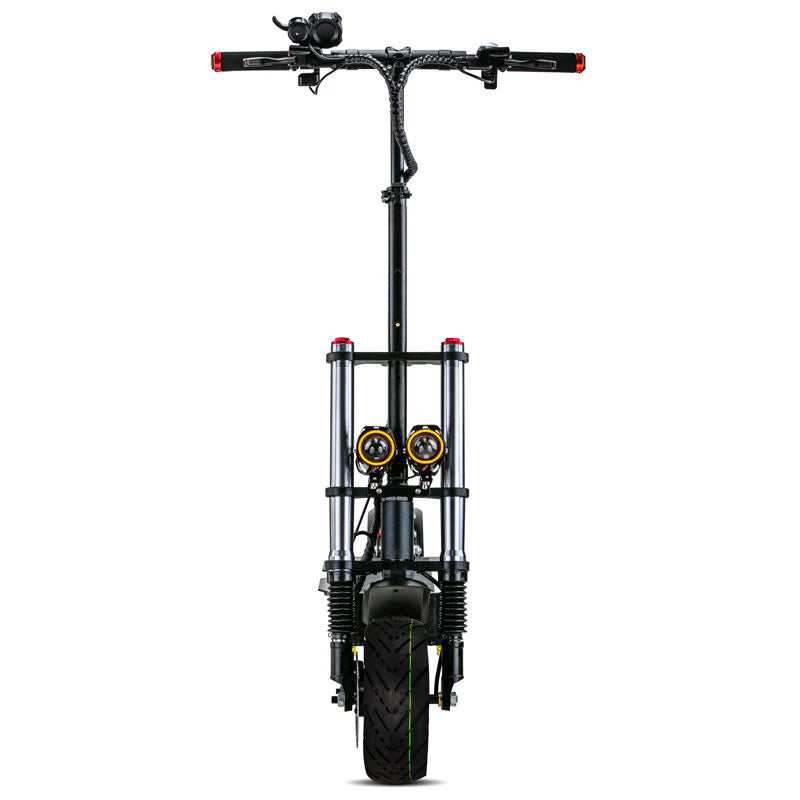 This Teewing X3 electric scooter for adults provides a powerful dual-motor system with 3200W of power, a 52V 28Ah lithium battery, and a top speed of 40mph. X3 has a range of up to 50 miles and is constructed with 10 inch road tires and front and rear hydraulic disc brakes for enhanced safety and stability. X3 e-scooter offers front long-distance hydraulic shock absorption and rear high-end damping hydraulic shock absorption for a smoother ride.