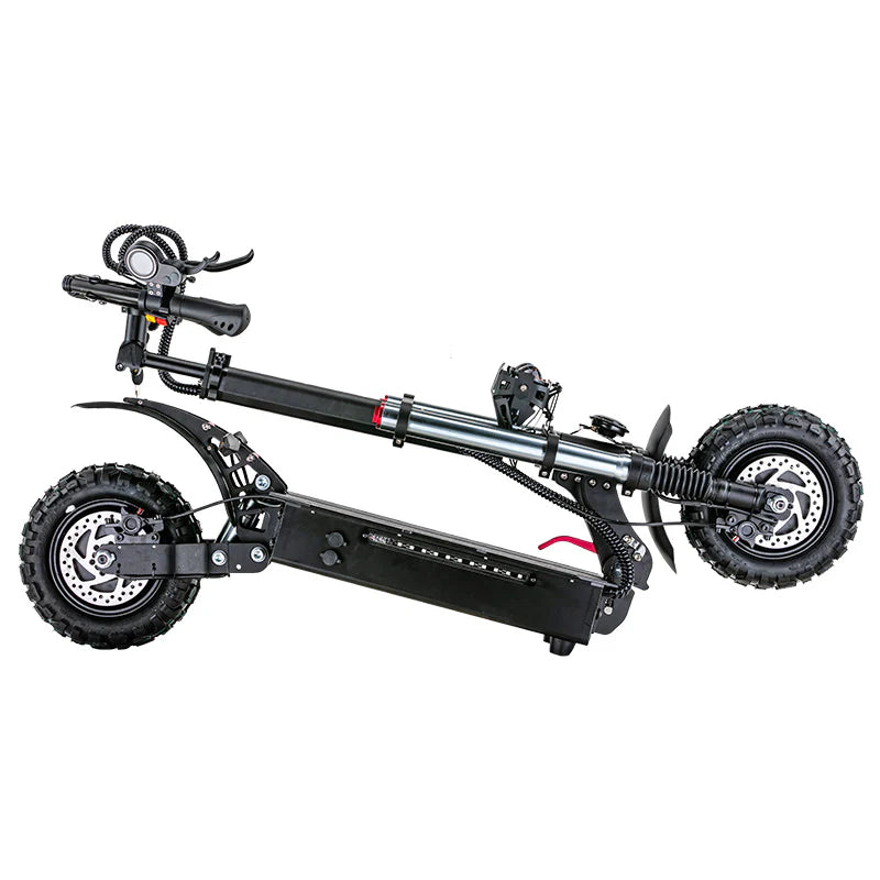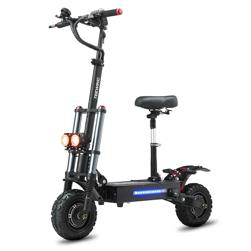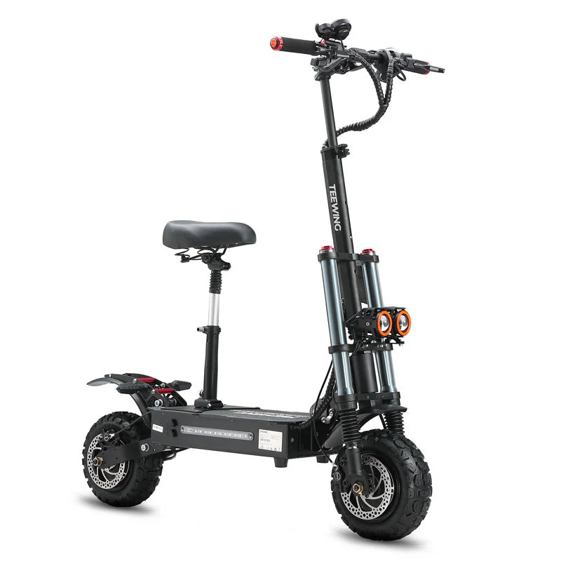 This Teewing X5 electric scooter for adults provides a powerful dual-motor system with 6000W of power, a 60V 38Ah lithium battery, and a top speed of 55 mph. X5 has a range of up to 75 miles and is constructed with 11 inch off road tires and front and rear hydraulic disc brakes for enhanced safety and stability. X5 e-scooter offers front long-distance hydraulic shock absorption and rear high-end damping hydraulic shock absorption for a smoother ride.